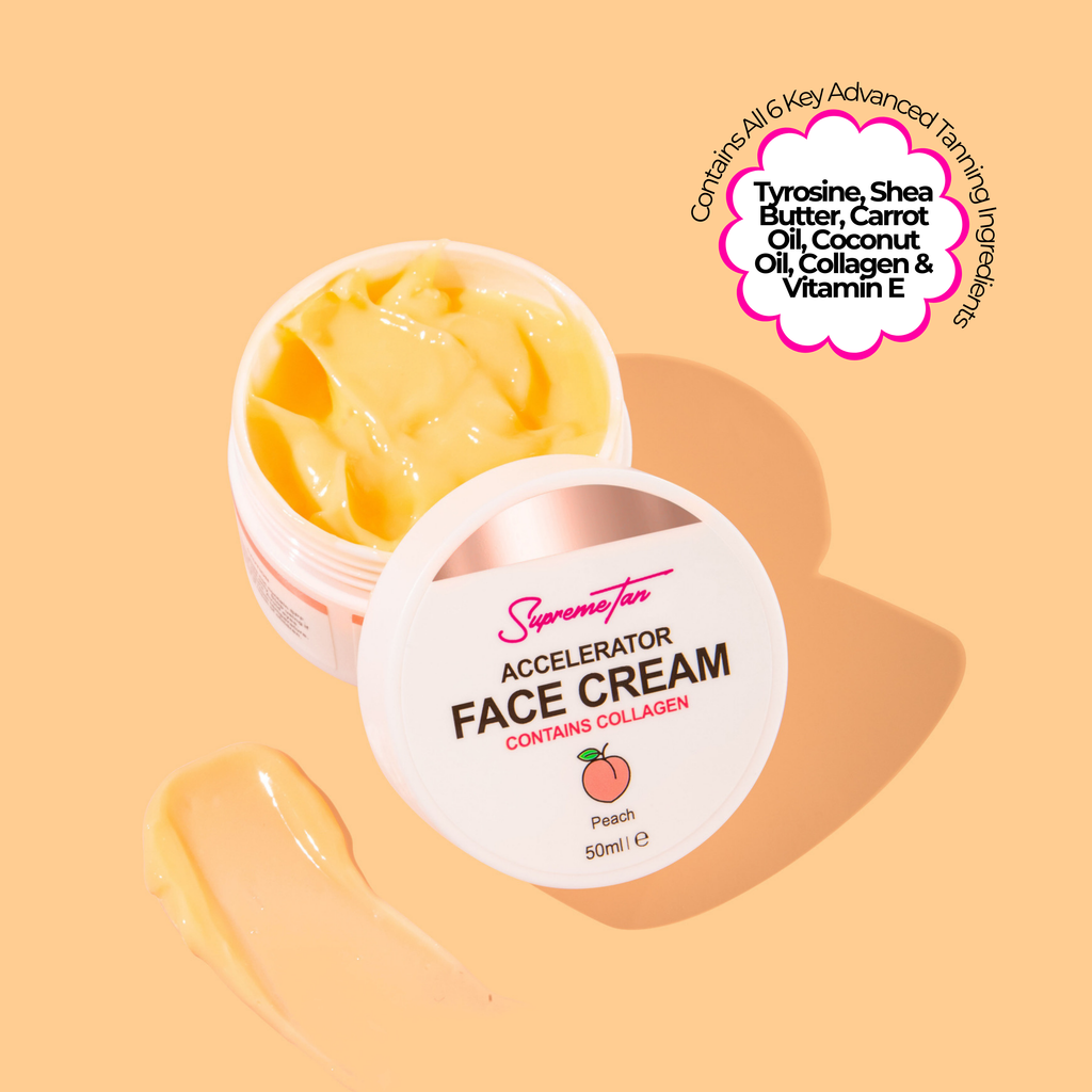 A face specific cream designed for dry or sensitive skin. This formula contains Tyrosine, Shea Butter, Coconut Oil, Carrot Oil, Collagen and Vitamin E to support your tanning routine while keeping the complexion comfortable. Finished with a soft peach scent.